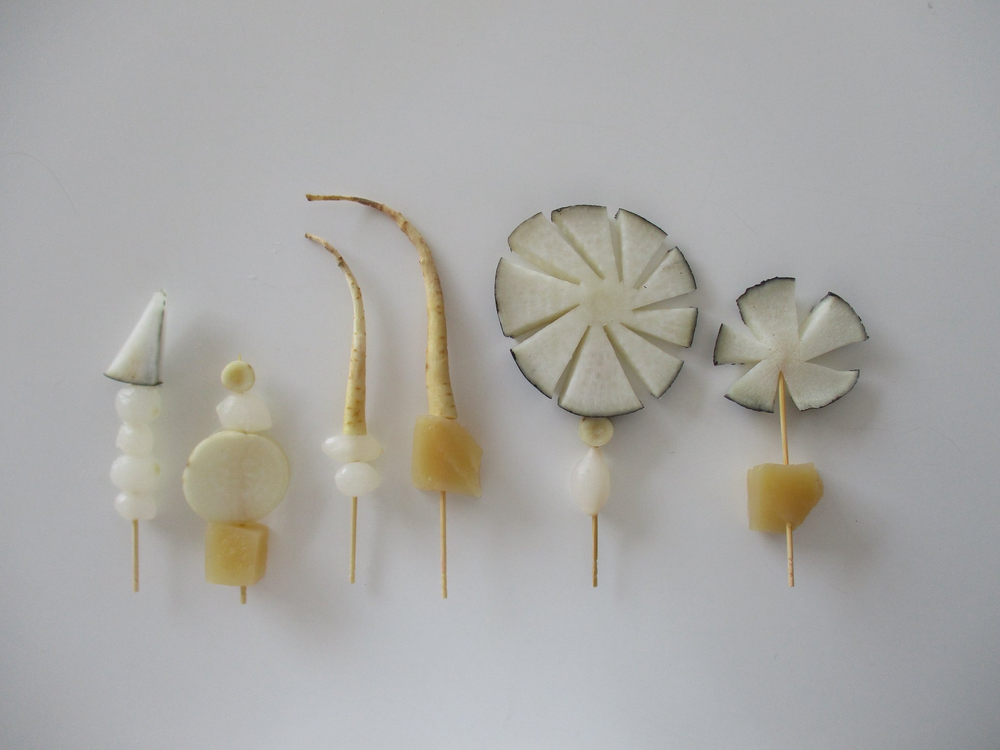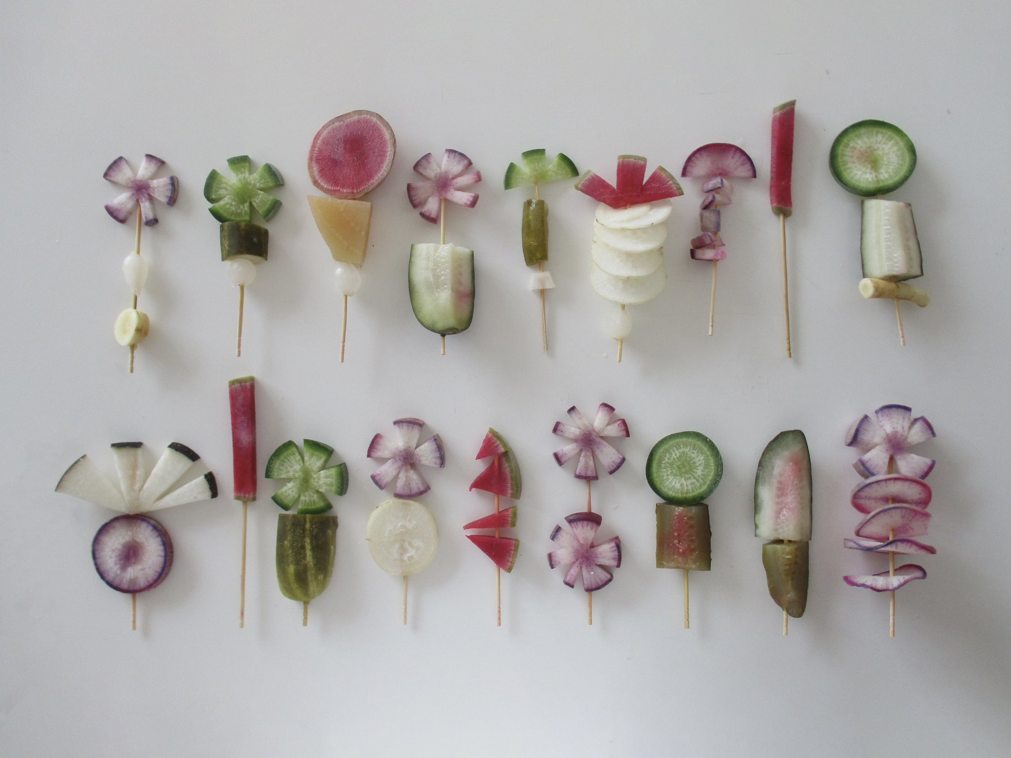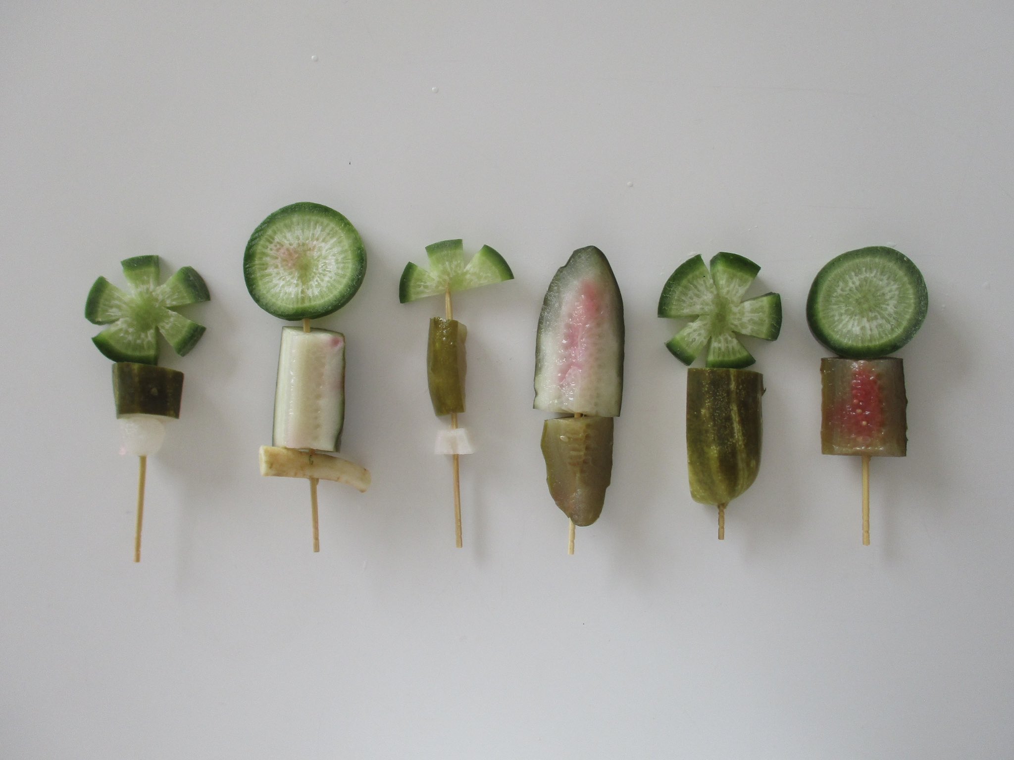 The unforeseen serenity in Lola Menteyrs‘ vegetables skewers: it beams in white, sprouts in green, it all works (via her X account).